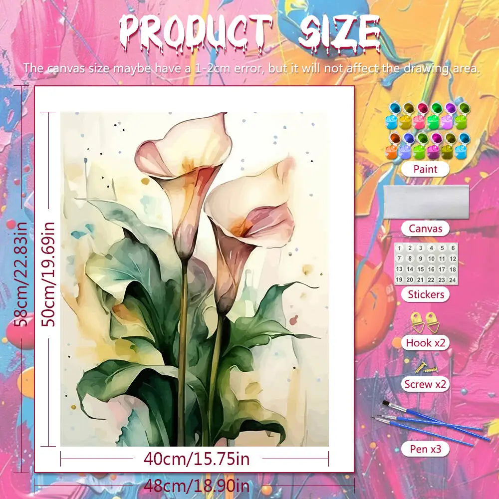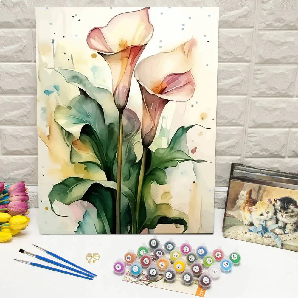 Skapa en harmonisk och elegant tavla med detta måla-efter-nummer-set som föreställer mjuka och stilfulla kalla-blommor. De lugna färgerna och akvarellkänslan gör motivet perfekt för alla som vill fylla hemmet med ro, skönhet och naturlig estetik.