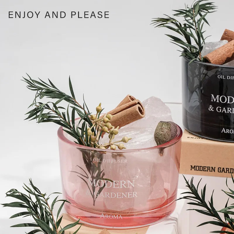 Skapa en lugn och harmonisk stämning i ditt hem med denna flamfria aromaterapi-dekoration. En stilren glasbehållare fylld med kristaller och naturliga dekorativa element som långsamt sprider doft när du tillsätter eterisk olja.